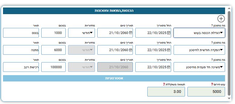 הזינו את הנתונים הפיננסיים שלכם – הכנסות, הוצאות, חסכונות, והשקעות