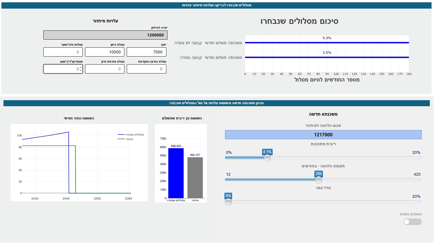בדיקת כדאיות למיחזור מסלולי המשכנתא, ניתן לבחור מסלולים מתיק המשכנתאות, להכניס את עלויות המיחזור ולבדוק באילו תנאים כדאי למחזר הן בהיבט ההחזר החודשי והן בהיבט סך הריבית שתשולם